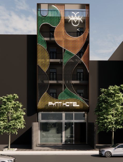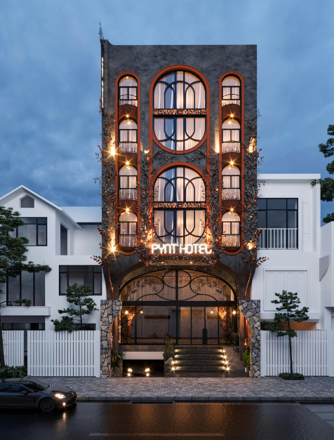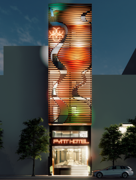 Pynt Hotel 1 tạo nên sức hút mạnh mẽ với thiết kế được lấy cảm hứng từ sự giao thoa đầy quyến rũ giữa kiến trúc đương đại và phong cách Trung Đông, mang một vẻ đẹp ấn tượng và khác biệt. Điểm nhấn đặc trưng của công trình nằm ở hệ khung thép uốn cong tinh xảo nhiều lớp, tạo hiệu ứng không gian đa chiều, độc đáo và đầy cuốn hút. Gam màu cam chủ đạo, biểu tượng của sự trẻ trung và hiện đại, được chọn lựa tỉ mỉ để đón đầu xu hướng tương lai.